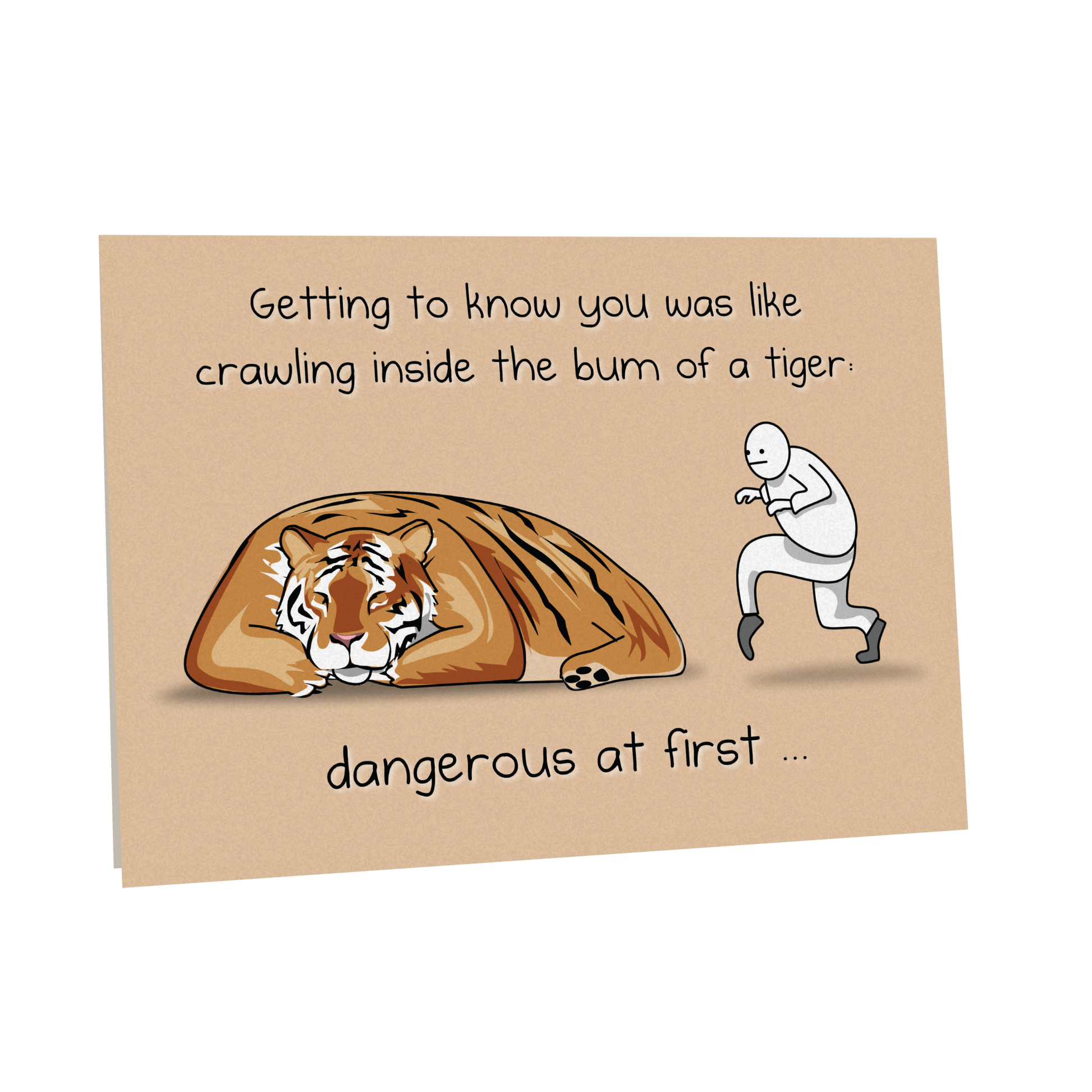 Looking for a hilariously inappropriate way to express your feelings? Our Tiger greeting card delivers adult humor with a wild twist. Each card features premium quality materials, bold artwork, and an envelope for easy gifting. Perfect for birthdays, anniversaries, or just because moments when conventional cards won't do. Make someone laugh today!