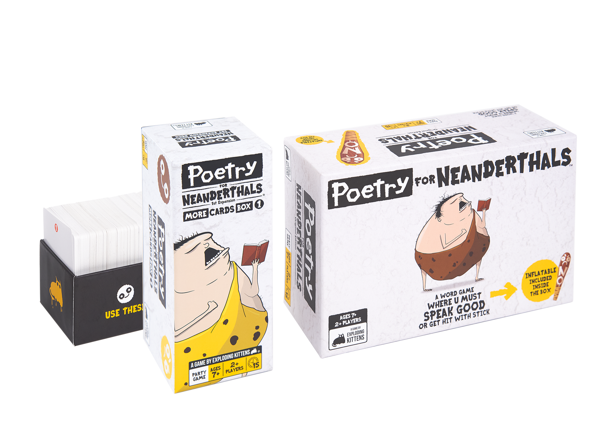 Poetry for Neanderthals is a word game where u must speak good or get hit with stick. Players earn points by getting their teammates to guess words and phrases. The catch is that they can only use single syllable words. This bundle includes both the base Poetry for Neanderthals game as well as the expansion pack More Cards Box 1. Play both pack 4 best game night.?