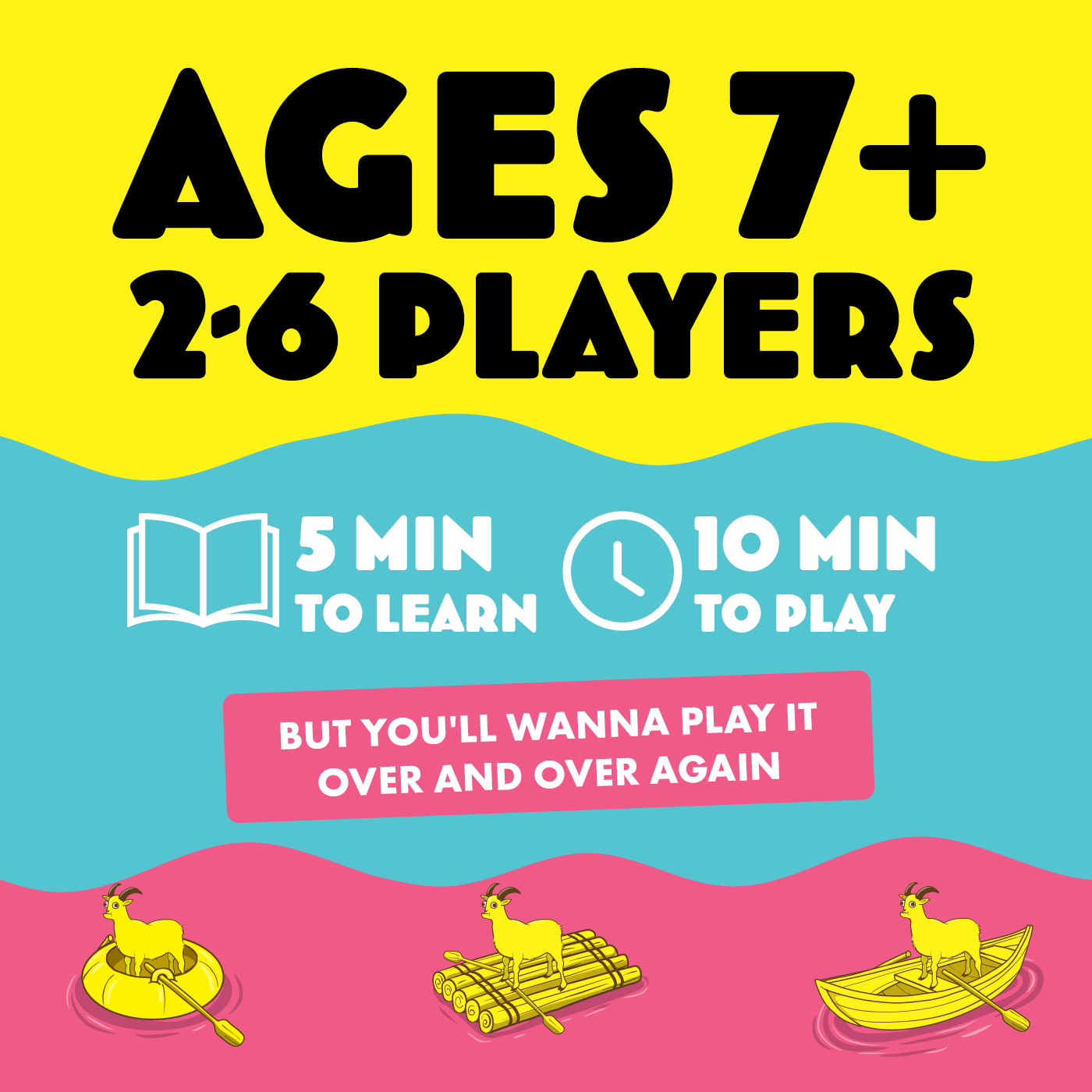Row Your Goat is a rapid-fire picture-matching, fast slapping game. Get rid of your cards by placing them in a grid. The second you see a matching set of 3 in a row, slap the nearest Lifesaver. Hurry, there's only a few of them. And if you don't grab one fast enough, you're left collecting cards. When you're down to one card, scream ¡°ROW MY GOAT¡±, play your card, and slap a Lifesaver to win.