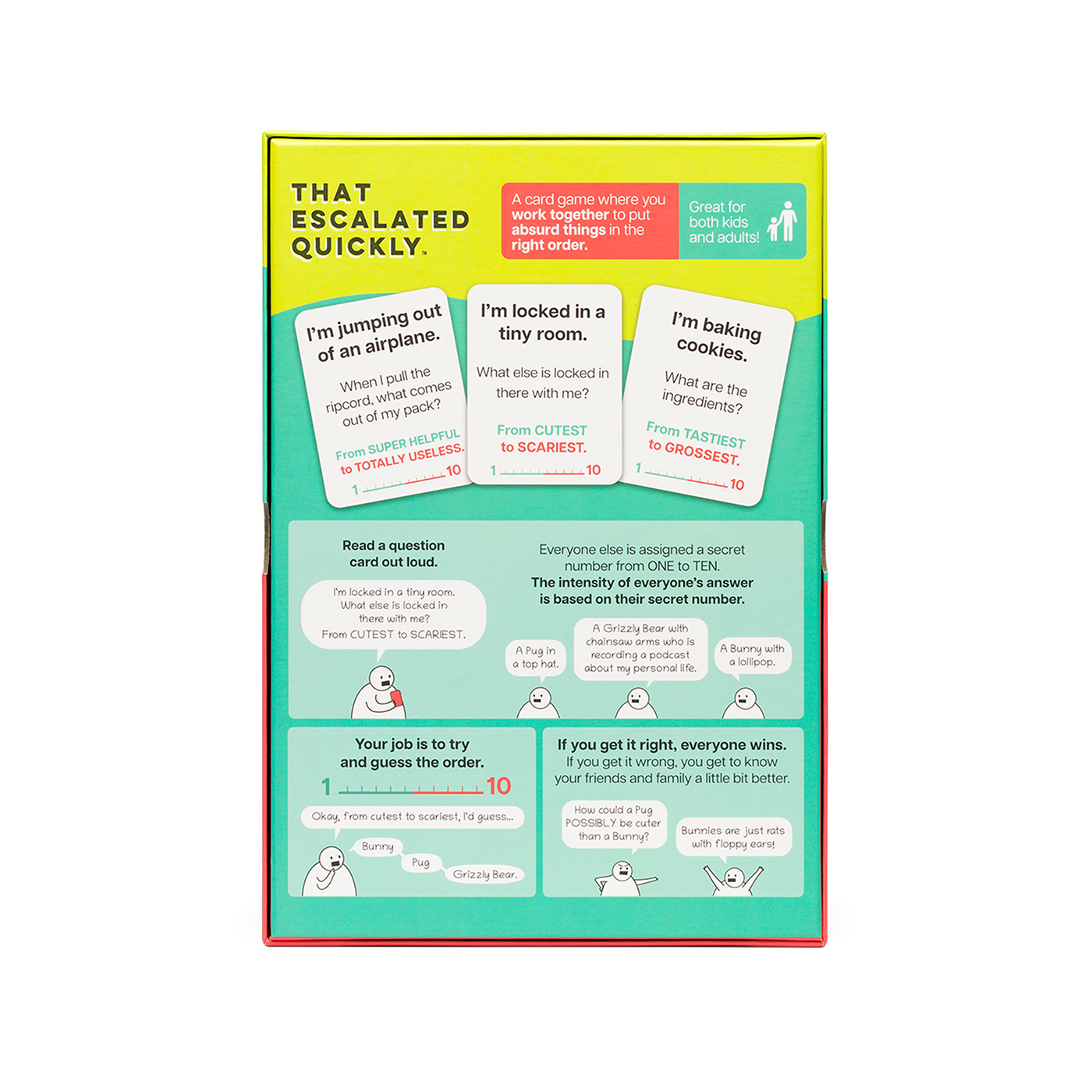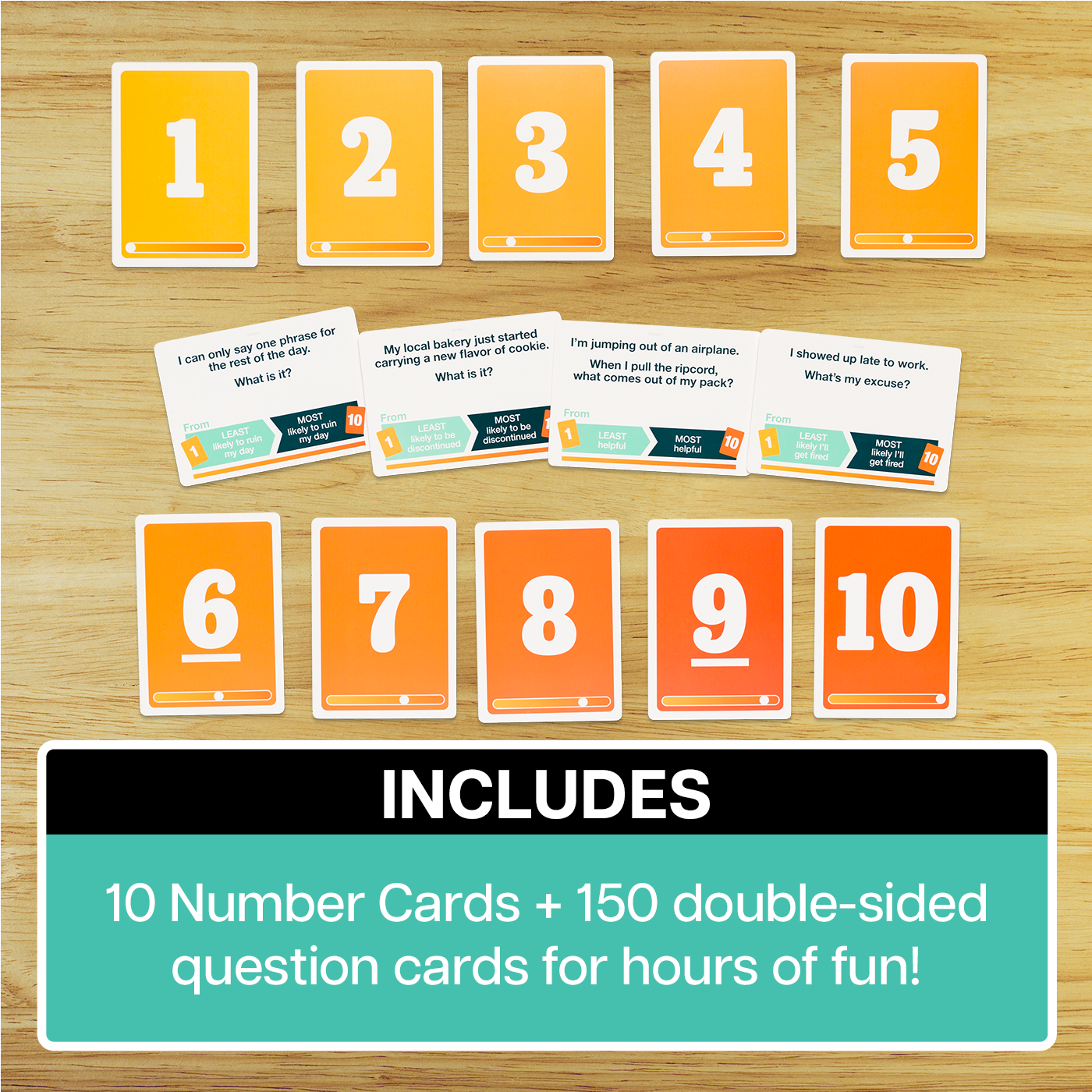 First, read out a simple question (ex. I¡¯m locked in a tiny room. What else is locked in here with me from cutest to scariest). Then everyone is assigned a secret number from one to ten. Next, each player gives an answer to the question, and the intensity of that answer is based on their secret number (ex. 1= a bunny, 10= a grizzly bear with chainsaw arms.) Finally, the person who read the question has to try and sort those answers into the correct order. If they get it right everyone wins!