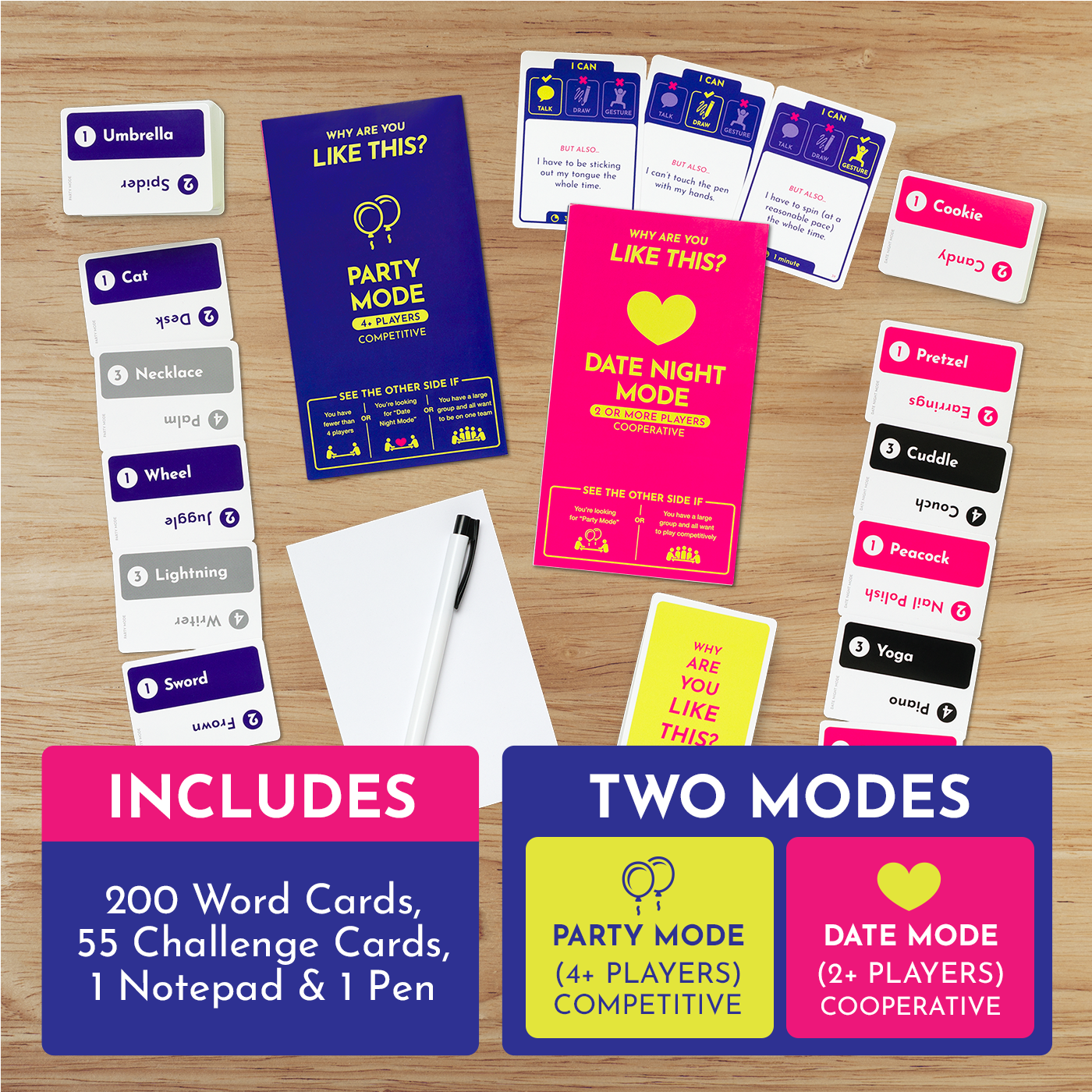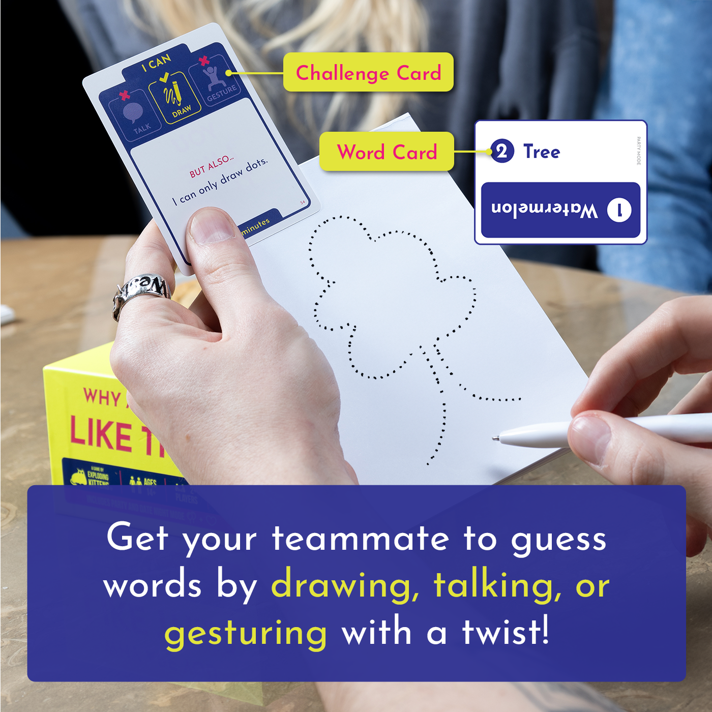 The goal is to get your team to guess as many secret words as possible before the timer runs out. To do this you can either talk, draw, or gesture. But there¡¯s a catch! Each card also comes with an added twist to make your job a little harder¨Cand more ludicrously entertaining. This game gets everyone out of their comfort zones and into a silly mood. It¡¯s perfect for parties, team building events, and rollicking game nights.?